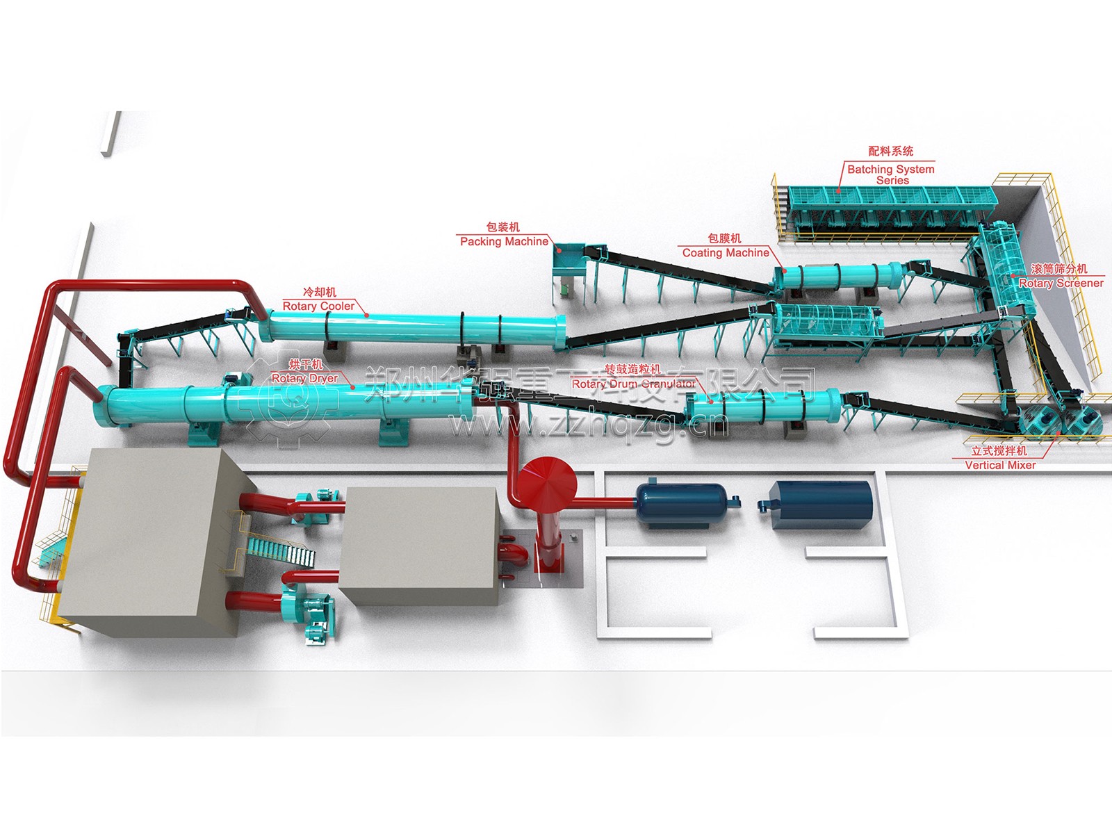 工藝流程:配料系統(tǒng)——滾筒篩分機(jī)——立式攪拌機(jī)——轉(zhuǎn)鼓造粒機(jī)——烘干機(jī)——冷卻機(jī)——自動(dòng)包裝機(jī)。